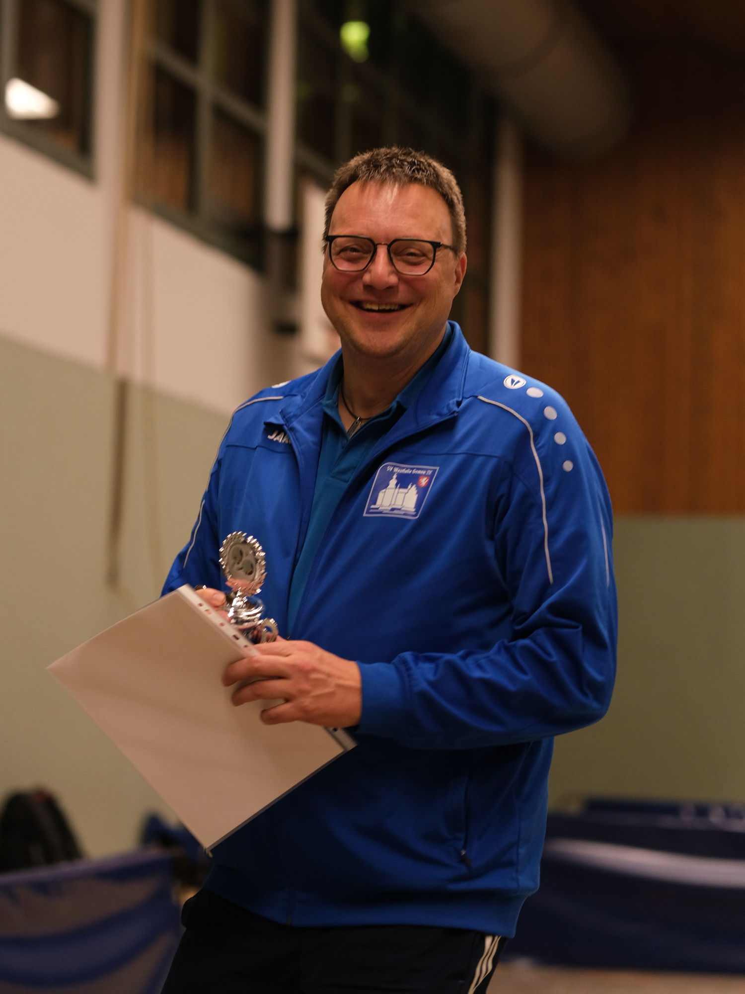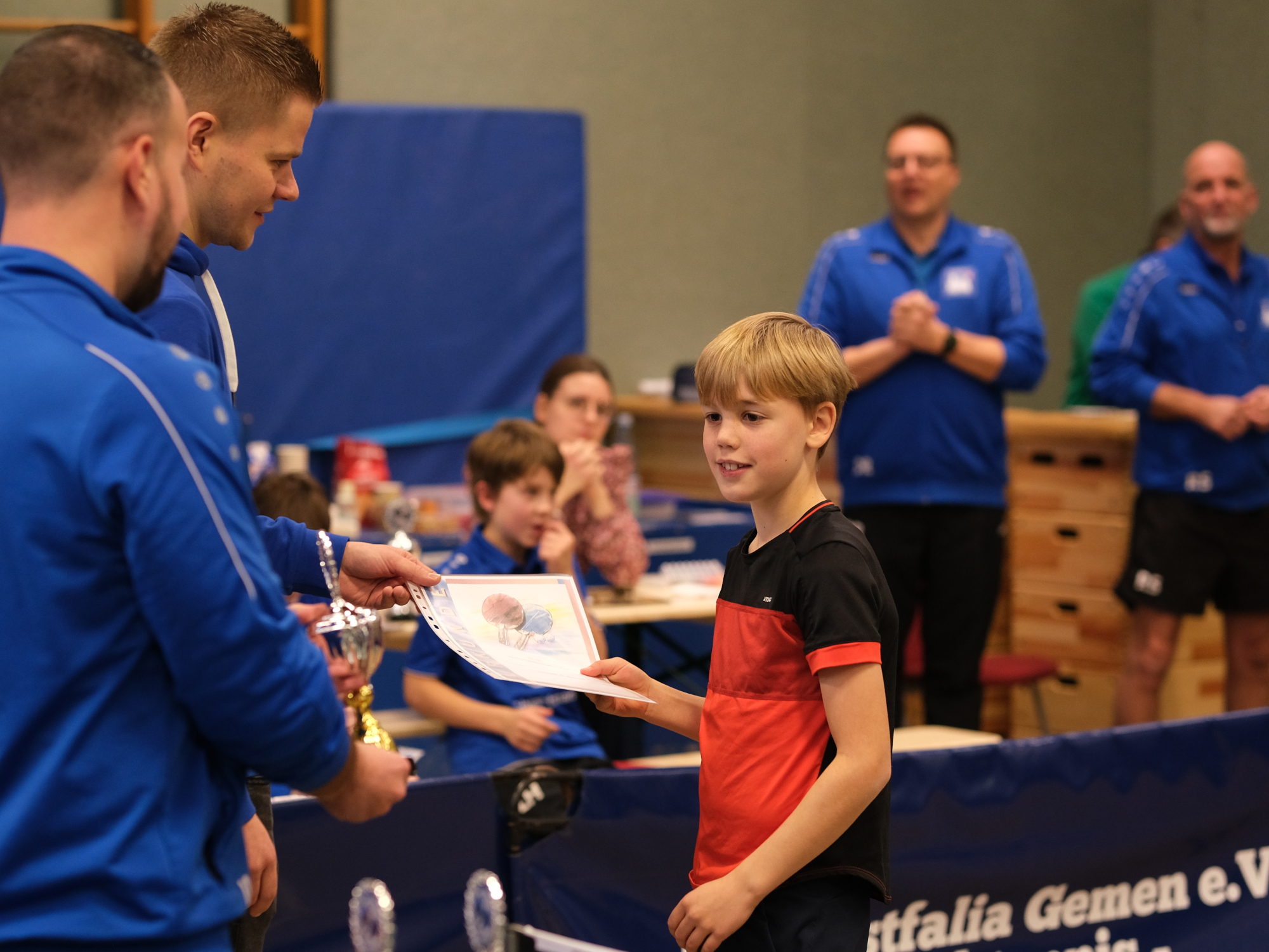 Nach den Siegerehrungen durch den zweiten Vorsitzenden Andreas Brand – der erste Vorsitzende Alexander Kemper ließ sich entschuldigen – gab es noch eine Überraschung. Allerdings nicht für die Nachwuchssportler*innen, sondern für ihr Trainerteam! Die Kinder überreichten einen großen Präsentkorb als Dankeschön für das erfolgreiche Jahr 2024. Eine tolle Geste, für die sich Dietmar Rinas – stellvertretend für das ganze Team – bei den Kindern und ihren Eltern herzlich bedankte.
