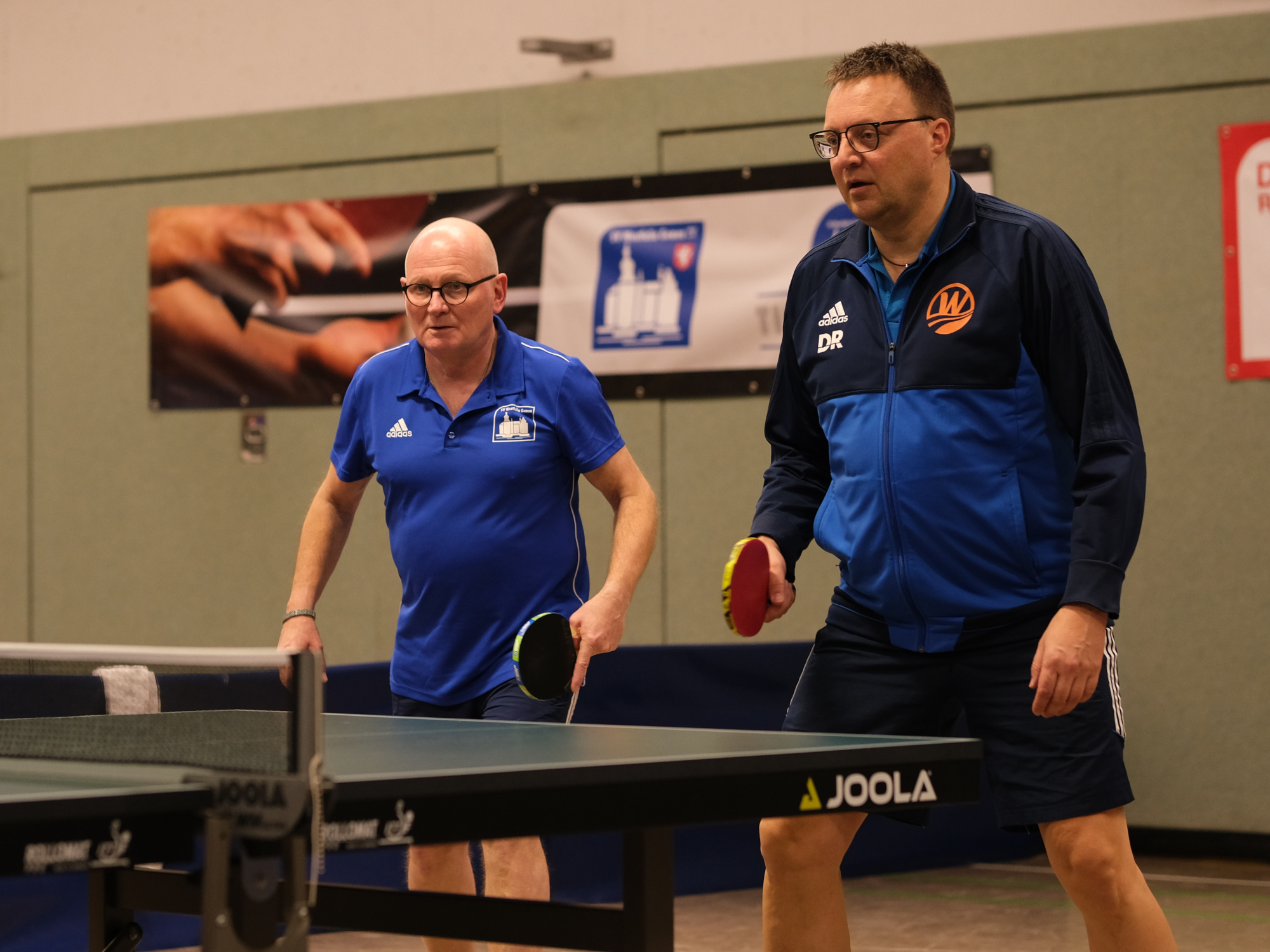 Im Anschluss an die Nachwuchs-Siegerehrungen starteten auch die Erwachsenen in das Turnier. Hier wurde das Teilnehmerfeld gemäß Spielstärke in die Gruppen A und B aufgeteilt. Die Paarungen für die Doppelkonkurrenz nach K.O.-System wurden aus je einer Person beider Gruppen gebildet. Im Finale standen sich dort schließlich das Duo Martin Wieschen / Michael Schenkendorf und das Duo Peter Gahlmann / Dietmar Rinas gegenüber. Letztere siegten relativ deutlich, worüber sie recht froh sein konnten, denn beide sollten noch ein weiteres Endspiel bestreiten.