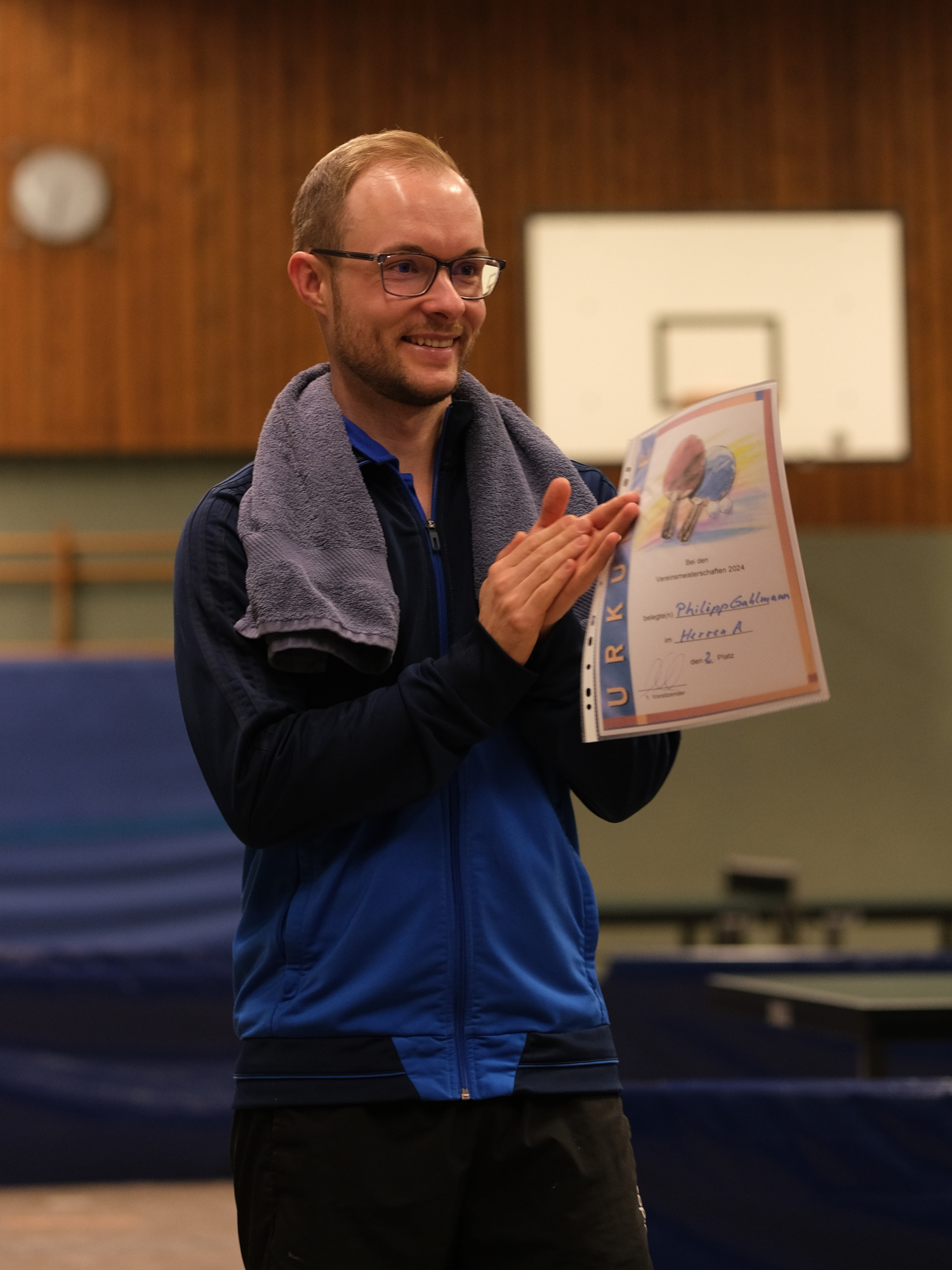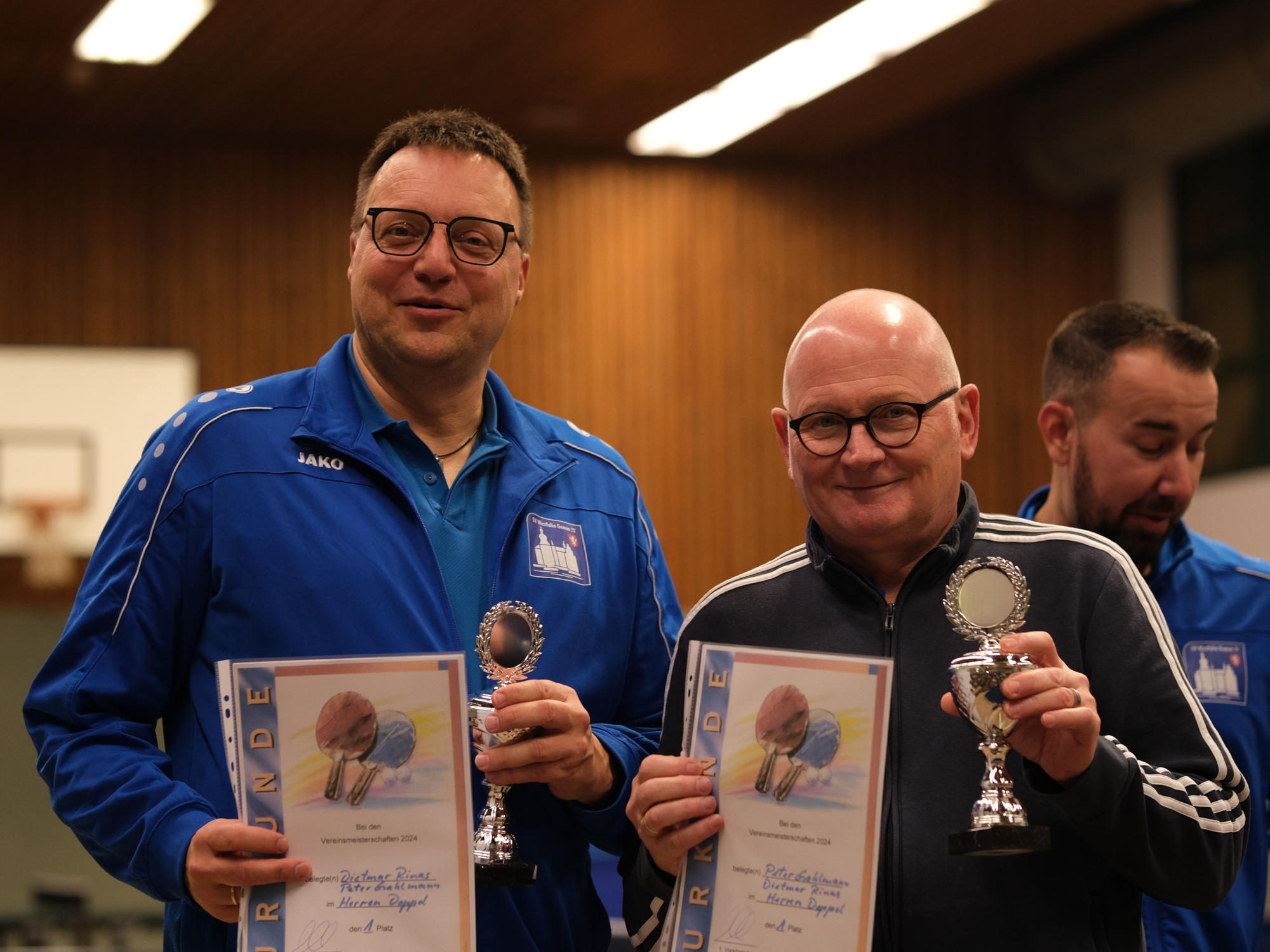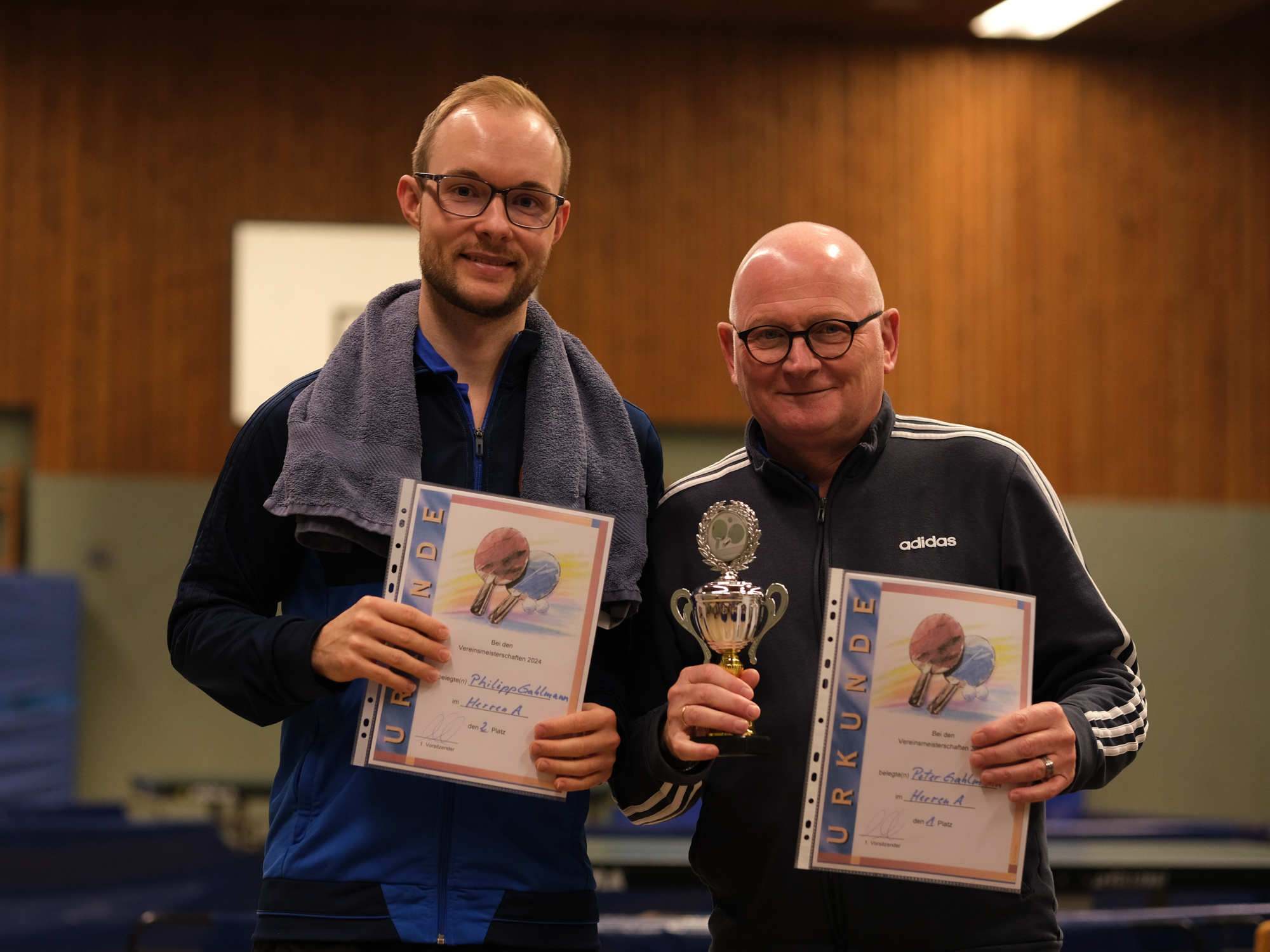 Gahlmann hingegen stand im Herren-A-Finale seinem Neffen Philipp gegenüber. Auf dem Weg dorthin hatte dieser seinen Onkel noch klar mit 3:0 besiegen können, doch im Finale schien das Blatt sich zu wenden. Zwar ging Philipp zunächst auch hier in Führung, aber nach einem temporeichen ersten Satz mit einigen tollen Topspin-Rallys, kamen ihm etwas das Fortune und die Treffsicherheit abhanden. Peter hingegen fand immer besser in die Partie hinein und konnte das Match letztlich für sich entscheiden. Somit heißt der neue Vereinsmeister der Tischtennis-Abteilung Peter Gahlmann!